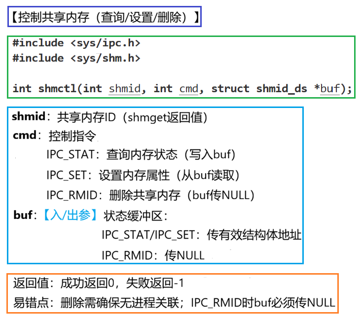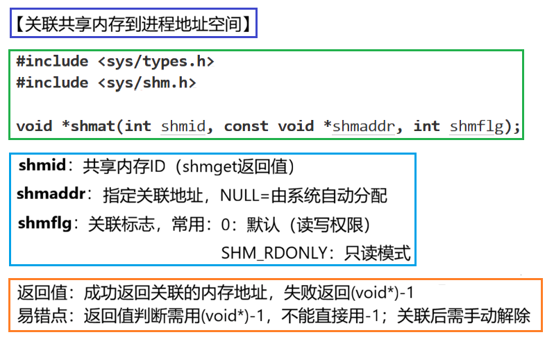 shmat()将共享内存段附加到自己的地址空间,获得指向该内存的指针。 - 双方直接通过指针读写共享内存进行数据交互,可用于对性能要求极高的场景(如大数据量实时传输)。
