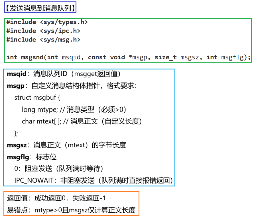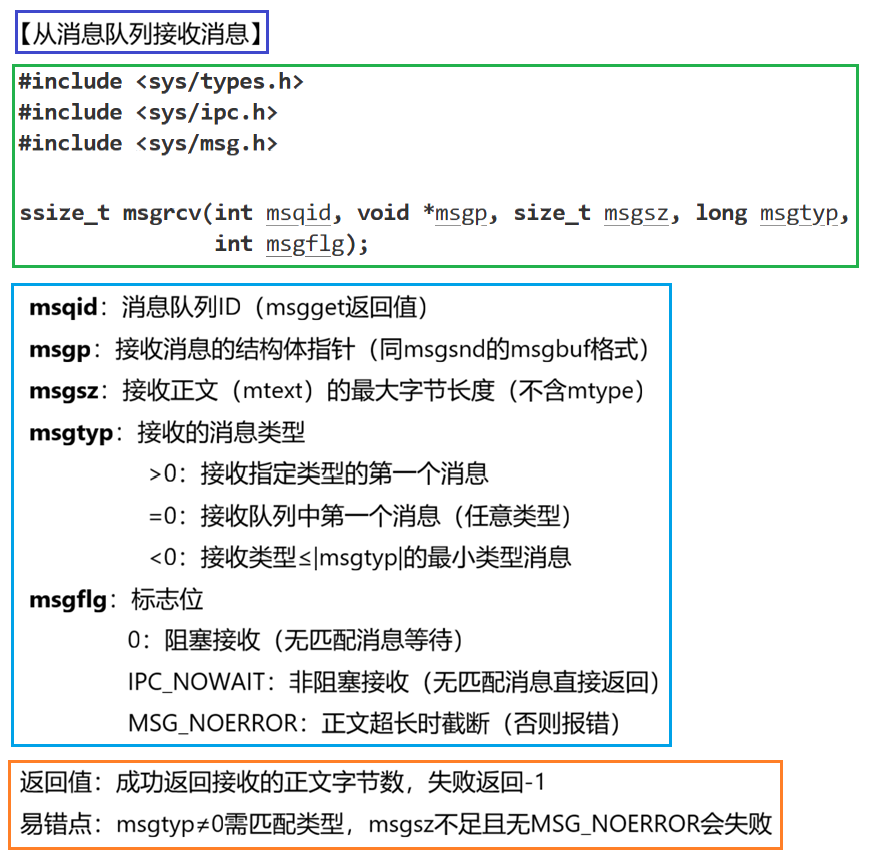 msgrcv()按类型(或顺序)从队列接收消息,可用于异步任务分发、消息路由、多对一 / 一对多通信等场景。 - 通信结束后,通过