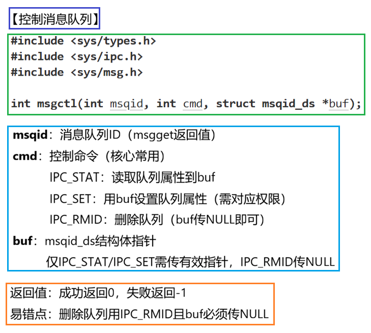 msgctl()或使用命令行工具删除。 - 常用管理命令:
