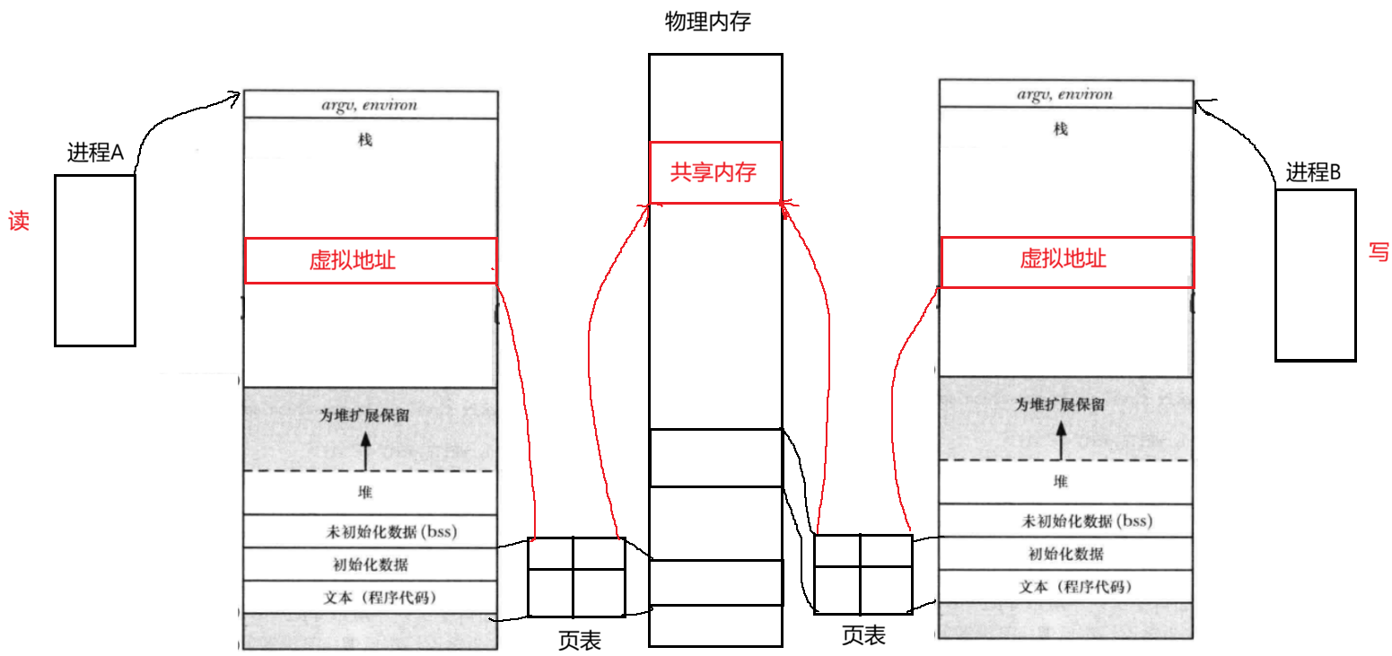 - 进程 A 和进程 B 通过将同一块物理内存映射到各自的虚拟地址空间,实现了数据共享。