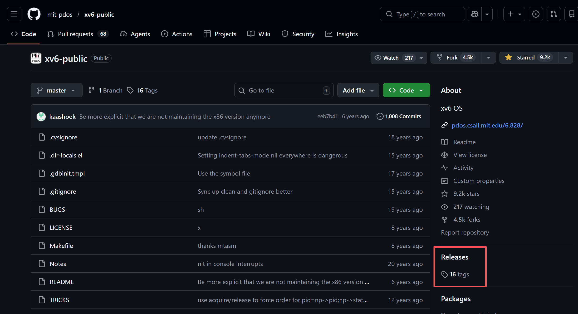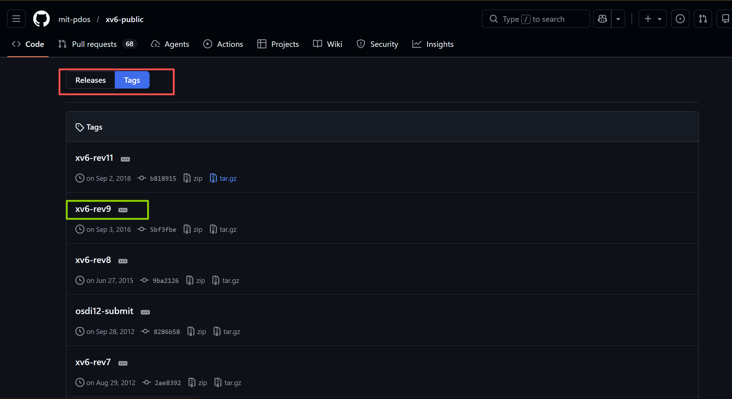 xv6-rev9是原始版本的一个tag,进入原始版本的仓库,注意到下面的Releases,点进去
