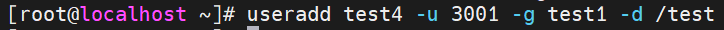新建账户 test4,UID=3001, 工作组=test1 , 家目录=/test: