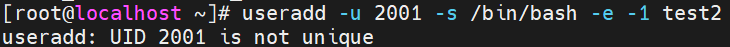 新建账户 test2,指定 UID 为2001、登录 Shell 为 /bin/bash ,账号永不过期: