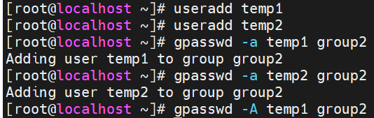 新建账户 temp1、temp2 后加入 group2 组,并指派 temp1 为 group2 工作组的管理员: