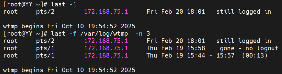 作用:列出目前与过去登入系统的用户相关信息,该命令默认会去读取 /var/log/wtmp 文件,并把该文件记录的登入系统的用户名单全部显示出来。