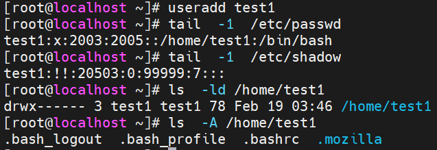 新建账户 test1,查看对应配置文件和家目录("!!"表示密码尚未设置):