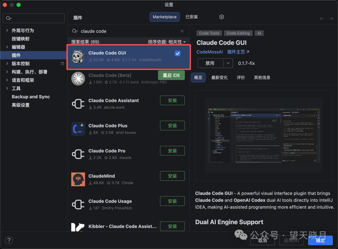 打开IDEA,点击右上角的设置(⚙),找到插件,点击进入插件市场,搜索并安装「Claude Code」插件进行安装。