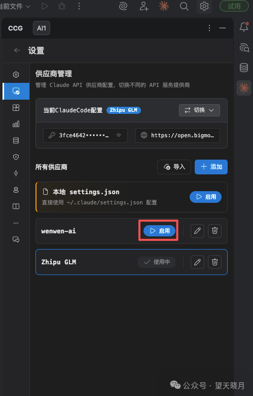 配置好后,点击确认添加,回到供应商列表,启用刚刚配置的GLM模型,这里支持配置多个api,点击当前配置右侧的切换按钮就可以切换