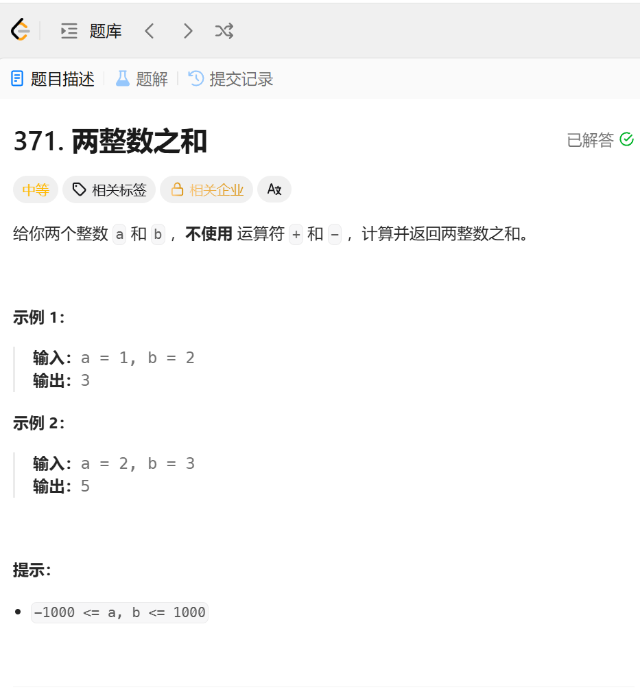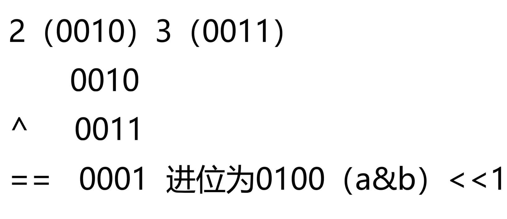 例如2^3==1(0001),异或以后惊奇的发现结果就是无进位相加后的结果,所以我们现在只需算出进位,再将两者异或,知道进位为0便可算出结果.