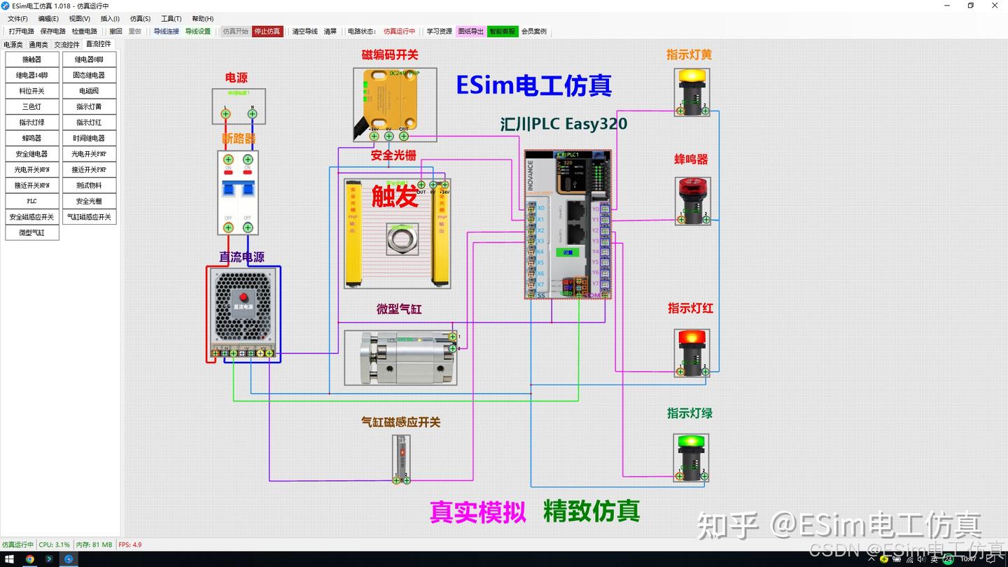 - 真实元器件库:100+种工业级元器件,包括汇川Easy320 PLC、汇川MD200变频器等真实设备模型