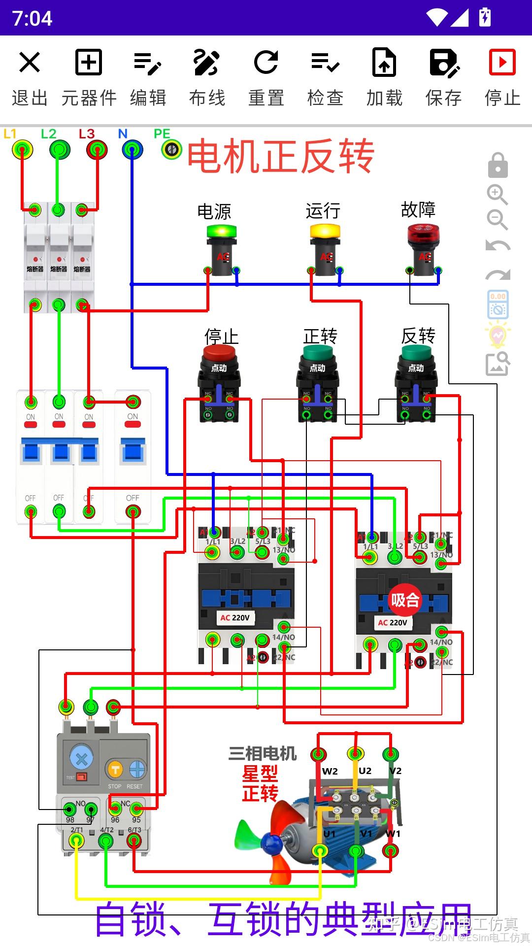 在ESim电工仿真中练习电机正反转、星三角启动、安全继电器、传感器应用等工业典型电路。掌握电气互锁、顺序控制等关键技术。