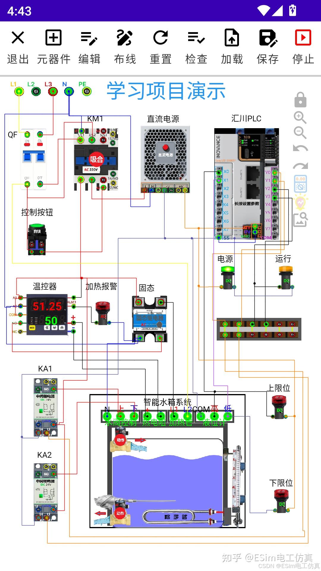 ESim电工仿真操作:在ESim电工仿真中打开"智能水箱学习系统"案例,设置参数,搭建控制电路,实现自动液位和温度联合控制功能