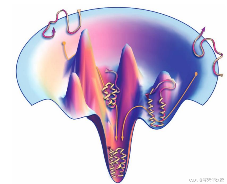 如图所示,相同的氨基酸序列可以折叠成多种不同的空间结构,这些结构对应不同的能量状态,而最低能量状态的结构便是蛋白质的"原生结构"。安芬森理论的重要性在于,它揭示了一种可能的计算方法:如果我们已知蛋白质的氨基酸序列,那么理论上就能够预测其原生结构。