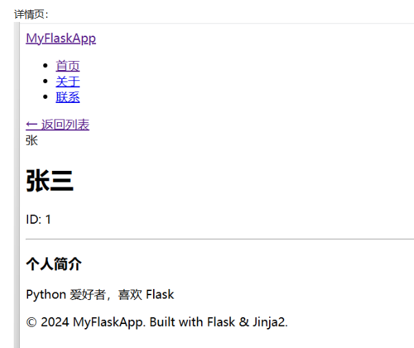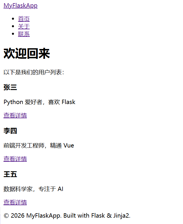 打开 http://127.0.0.1:5000/ 即可看到效果。点击用户卡片可以进入详情页,体验模板继承和动态路由的功能。