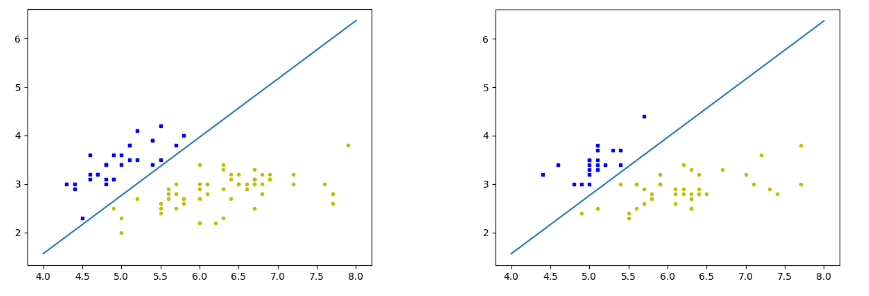 接下来,初始化了一个SVM模型,并使用训练集对其进行训练,其中设置了迭代次数上限为10。训练完成后,定义了一个绘图函数plot_figure,该函数用于可视化SVM的决策边界。这个函数计算了决策边界的方程,并在图上绘制了两个类别的数据点以及决策边界。最后,分别对训练集和测试集调用了绘图函数,以展示模型在这两个数据集上的表现。