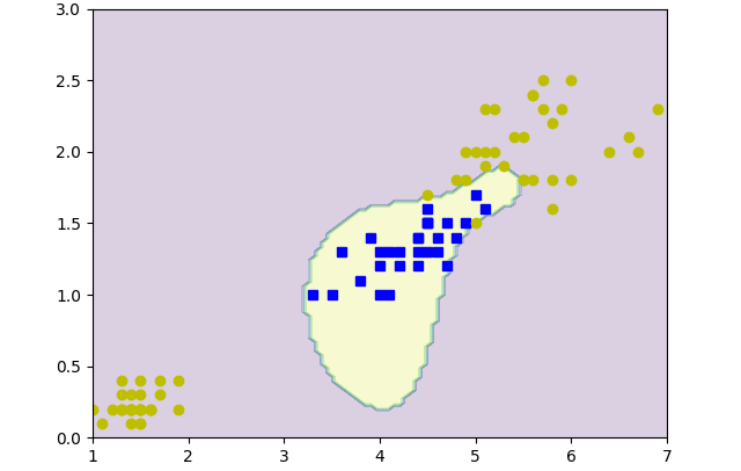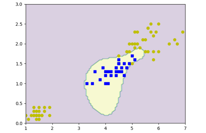 最后,提供了一个使用径向基函数(RBF)核的核SVM模型,用于鸢尾花数据集的分类。模型首先加载鸢尾花数据集,然后提取特定的特征,并将其分为训练集和测试集。模型使用RBF核函数来计算核矩阵,并在训练集上训练。训练完成后,模型预测了一个网格上所有点的类别,并使用等高线图来可视化决策边界,显示了不同类别的区域。