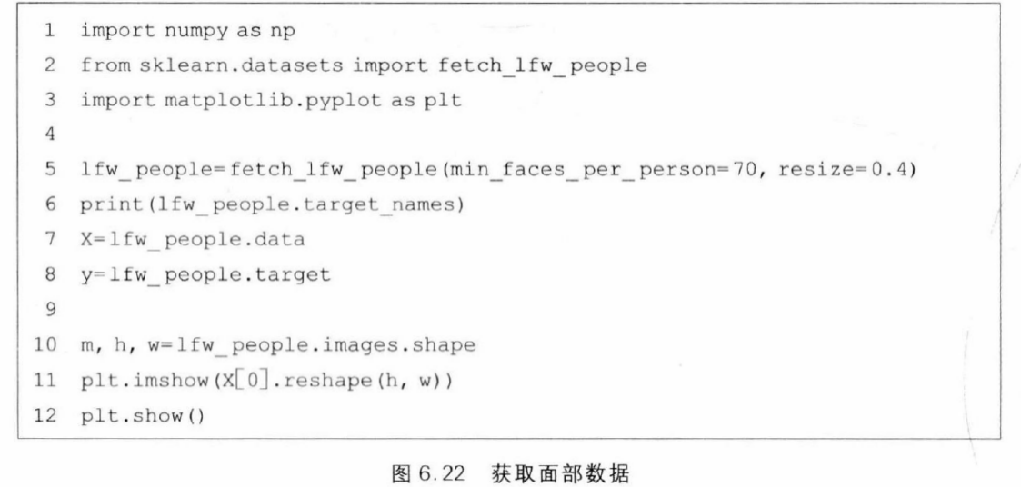 图6.22是获取与观察数据的程序。第2行导入获取数据的函数fetch_lfw_people。第5行调用该函数读取数据。第6行打印target_names,从而可以获得标签与人名的对应关系,例如标签3对应George Bush。第7、8行分别获取特征与标签。第10~12行打印出一张图片。
