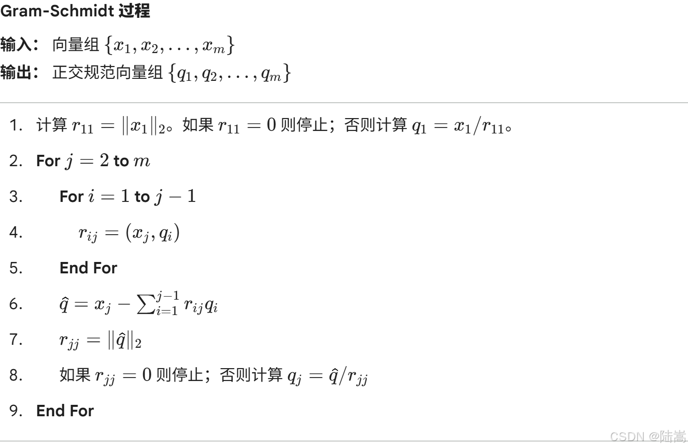 其中, r i j r_{ij} rij 是第 j j j 个向量在已正交化空间的投影向量系数, x i x_i xi 是原向量, q i q_i qi 是正交化后的向量。