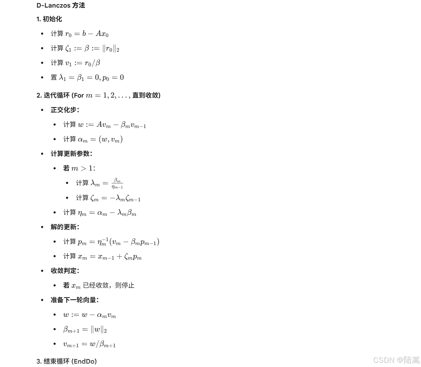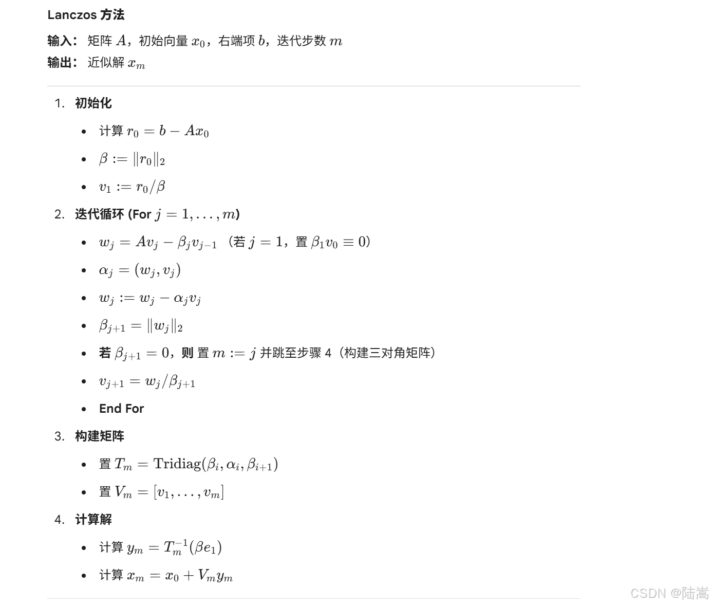 - Lanczos 算法中,三对角方程组的求解步骤通过 L U LU LU 分解待定系数法,得到的迭代关系式融入到 Lanczos 迭代过程中,为 D-Lanczos 算法。