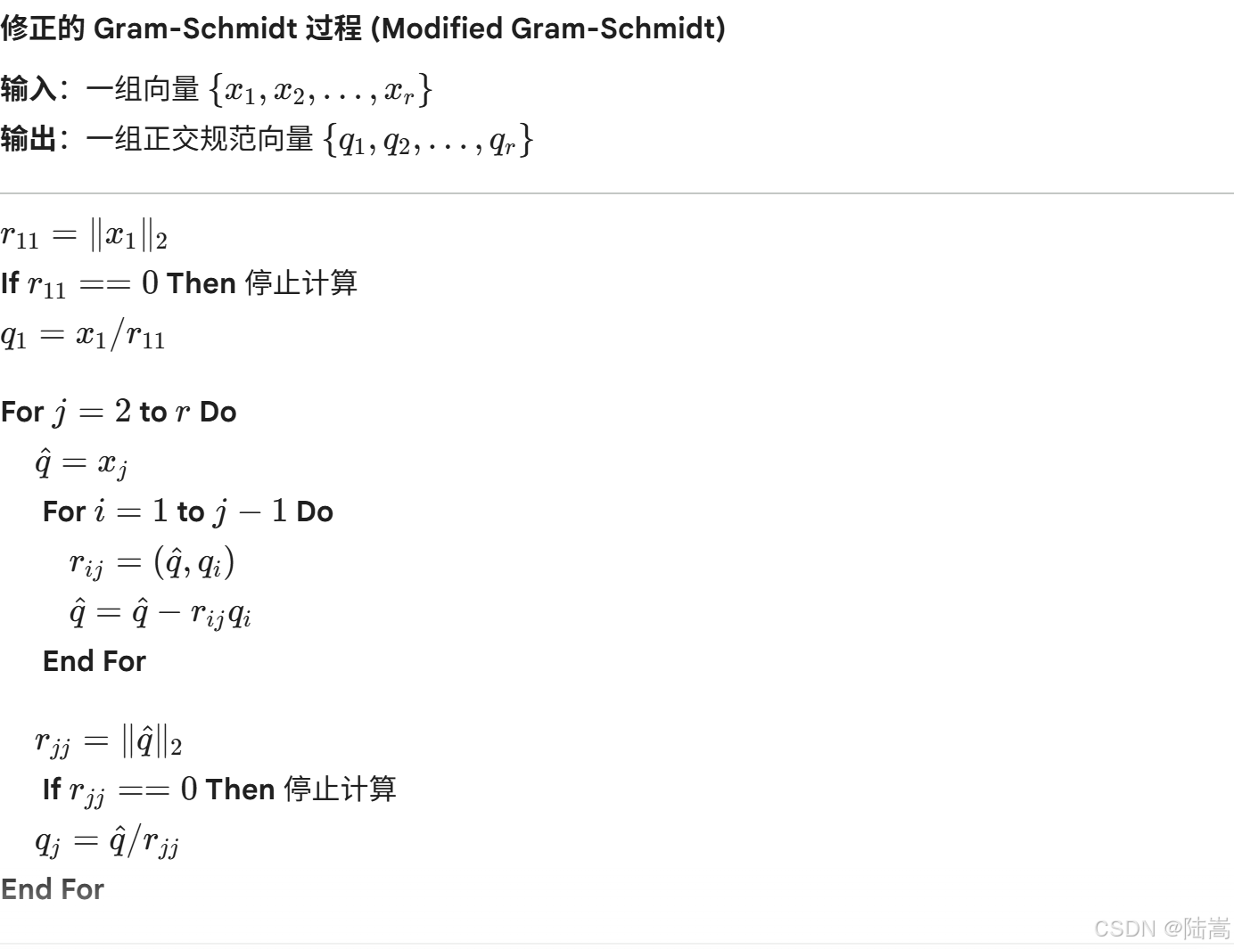 考虑舍入误差的情况,有如下改进版本的 Gram-Schmidt 算法: