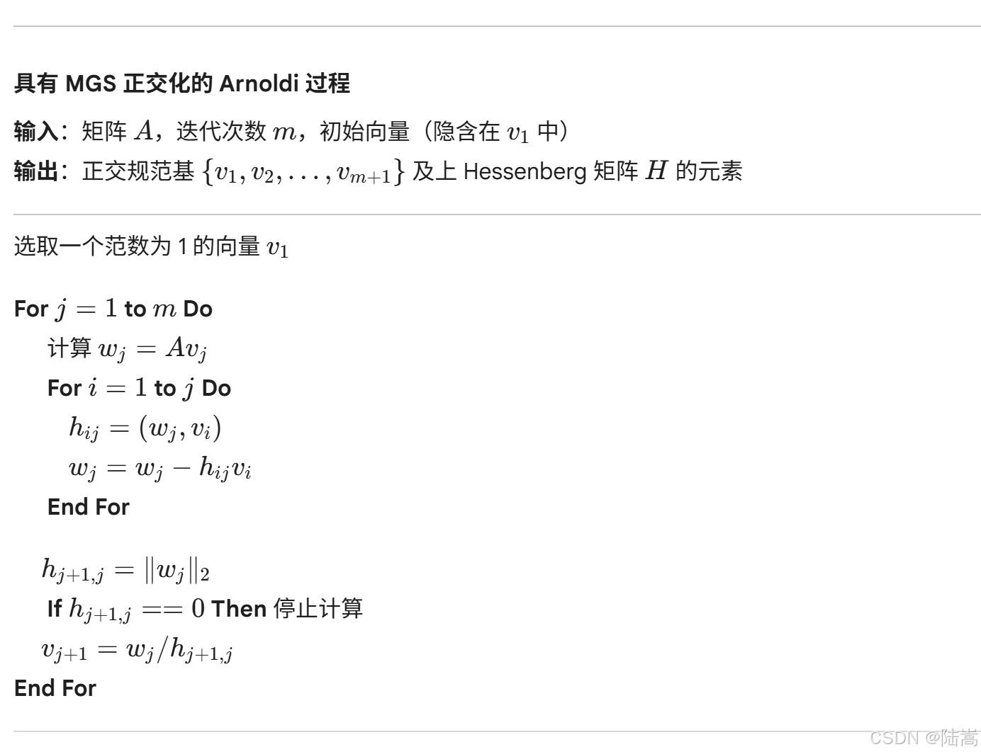 自然的基底并不是正交的,我们可以通过 Gram-Schmidt 过程,结合 Krylov 子空间的概念,生成一组正交基,这个过程叫 Arnoldi 过程,核心算法流程如下: