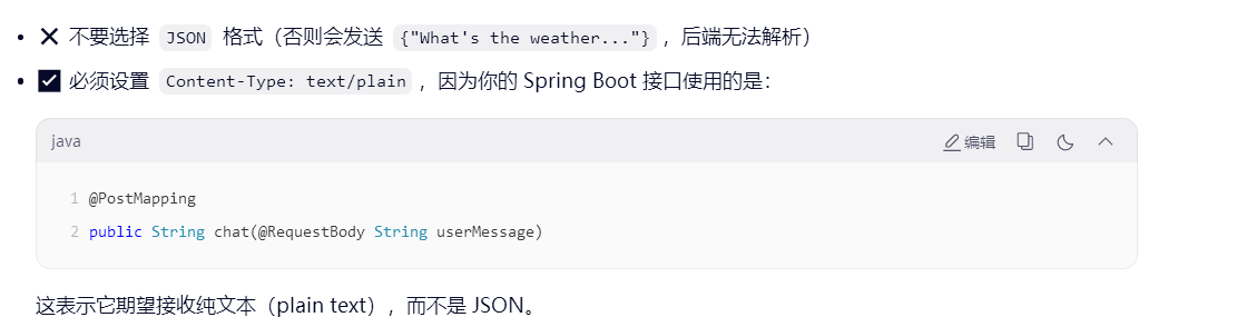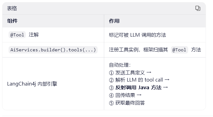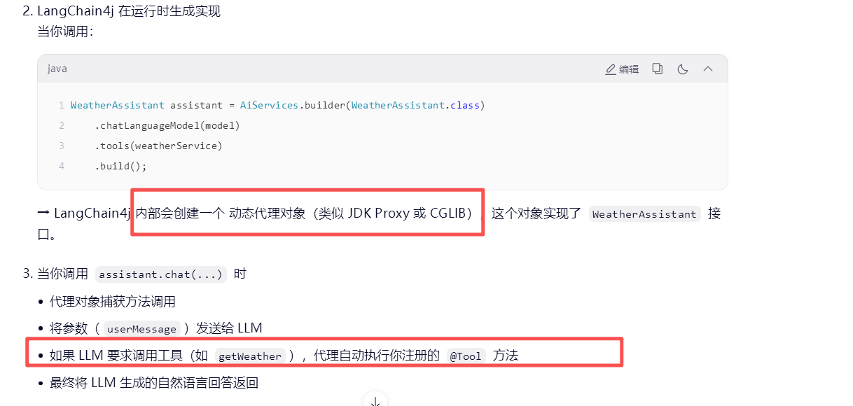 在 LangChain4j 的方案一 中,getWeather(String city) 方法的调用是 由 LangChain4j 框架自动完成的 ,你不需要手动解析 LLM 的输出或显式调用该方法。整个过程对开发者是透明的,**只需通过 @Tool 注解声明工具方法,框架会在 LLM 决定需要调用工具时自动执行它。**只需用 @Tool 标记方法,并通过 .tools() 注册实例,LangChain4j 会在 LLM 需要时自动反射调用它,并将结果无缝集成到对话中。