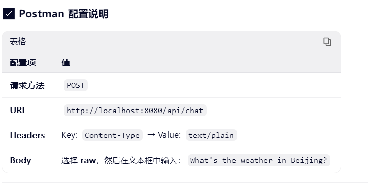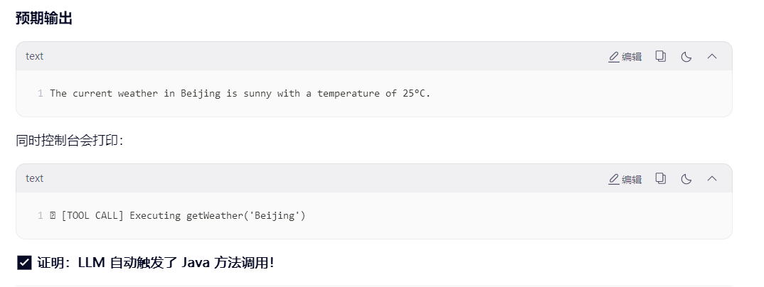 → LLM 识别需要调用 getWeather(String city) 工具
