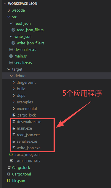 在学习Rust语言的时候,写的示例经常是一个rs文件,在练习的过程中经常会写多个应用程序示例,这样每个应用程序都需要单个编译,或者放在不同的目录下。那么有没有一个结构组织,可以同时编译多个应用程序,运行时指定某个程序即可呢。本文件以Json数据的包装解析,保存Josn数据到文件,读取Json文件数据的示例展示多应用程序操作。