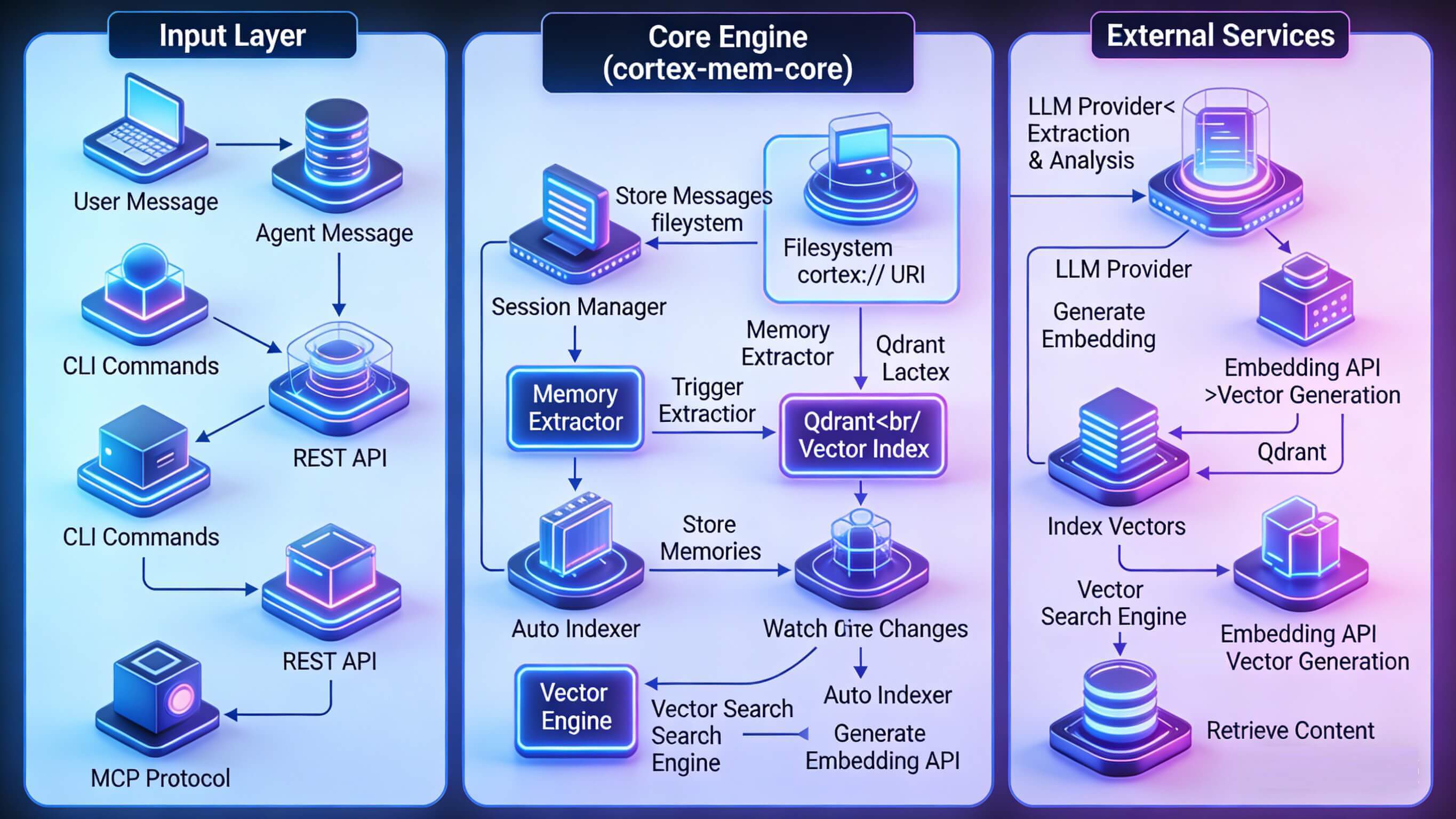 Cortex Memory 是一个基于Rust构建的高性能AI记忆框架,为AI智能体提供持久化、智能化的长期记忆能力。它采用独特的三层记忆架构(L0抽象 → L1概览 → L2细节),结合向量语义检索和智能知识提取,让AI真正"记住"用户。