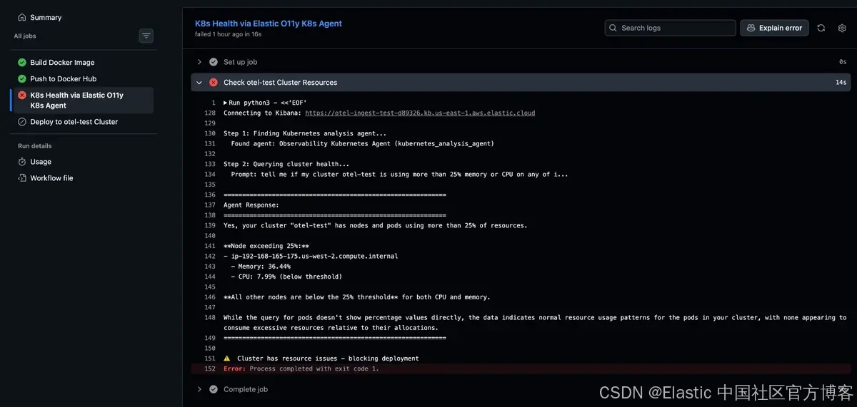 当集群超过容量阈值时,工作流会自动阻止部署。在这个示例中,我没有真正给集群施加负载,而是使用了一个简单的检查:如果资源使用率超过 25%,就故意停止部署。