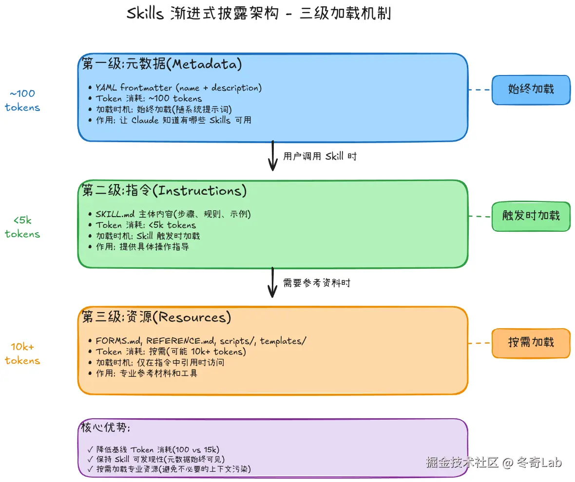 - 渐进式披露架构:三级加载机制