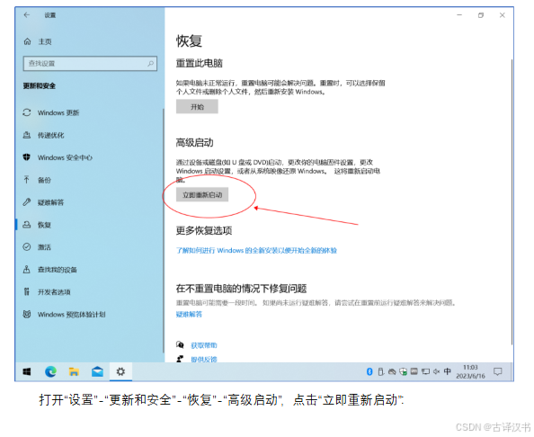 进入蓝色界面后选择:疑难解答 → 高级选项 → 启动设置 → 重启