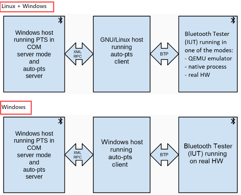 auto-pts client: 使用 Python 3 实现。可运行于 GNU/Linux 或 Windows 系统,与 auto-pts 服务器进行通信(以启动/停止测试用例、向 PTS 查询发送响应),并与待测实现进行通信以执行相应操作。