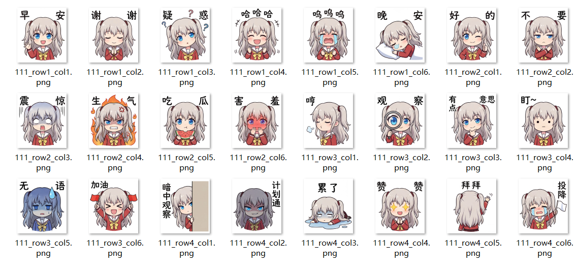 彩色手绘风格,使用4x6布局,涵盖各种各样的常用聊天语句,或是一些有关的娱乐meme,图片均有白色描边,添加角色主题色单色文字,纯绿色背景