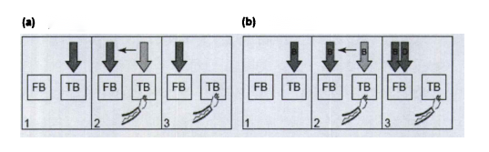 以"Sally-青蛙"任务为例作做出具体的说明。如图1,根据ToMM-SP模型,真实信念(TB)最初比错误信念(FB)显著,并吸引了注意性标识(图中的箭头)。当抑制(图中的手臂)作用于TB位置时,会降低TB的显著性,导致注意性标识转移至FB位置。双抑制模型(图(a))与返回抑制模型(图(b))对抑制过程进行了更详细的描述。从一个注意性标识分为了两个:信念和愿望。且信念注意性标识的注意力程度大于愿望注意性标识的;从一个抑制分为了两个:信念和愿望。虽然抑制分为了信念抑制和愿望抑制,但在错误信念接近愿望任务中,只需对信念进行抑制。两个抑制模型之间的区别在于:前者的信念和愿望的注意性标识是绑定的,因此对信念进行抑制时,信念和愿望的注意力标识会一起转移到FB;而后者分别对信念(标识B)和愿望(标识D)进行标识,且对信念的抑制先于对愿望的抑制,当对信念抑制时,信念的注意力标识从TB转移到FB,由于此时在FB的注意力更大(信念注意性标识的注意力程度大于愿望注意性标识的),愿望标识也会被吸引到FB中。在错误信念接近愿望任务中,这两个模型均能正确作出预测。