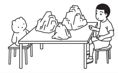 视觉观点采择最早可追溯至皮亚杰(Piaget,1932)所设计的"三山实验",如图4。该实验材料是一个包括三座高低、大小和颜色不同的假山模型,实验首先要求儿童从模型的四个角度观察这三座山,然后要求儿童面对模型而坐,并且放一个玩具娃娃在山的另一边,要求儿童从四张图片中指出哪一张是玩具娃娃看到的山。显然,不同视角所看到的内容不同,这就需要被试能想象出在玩具娃娃视角看到的内容才能正确完成任务。