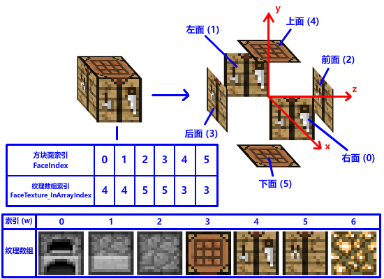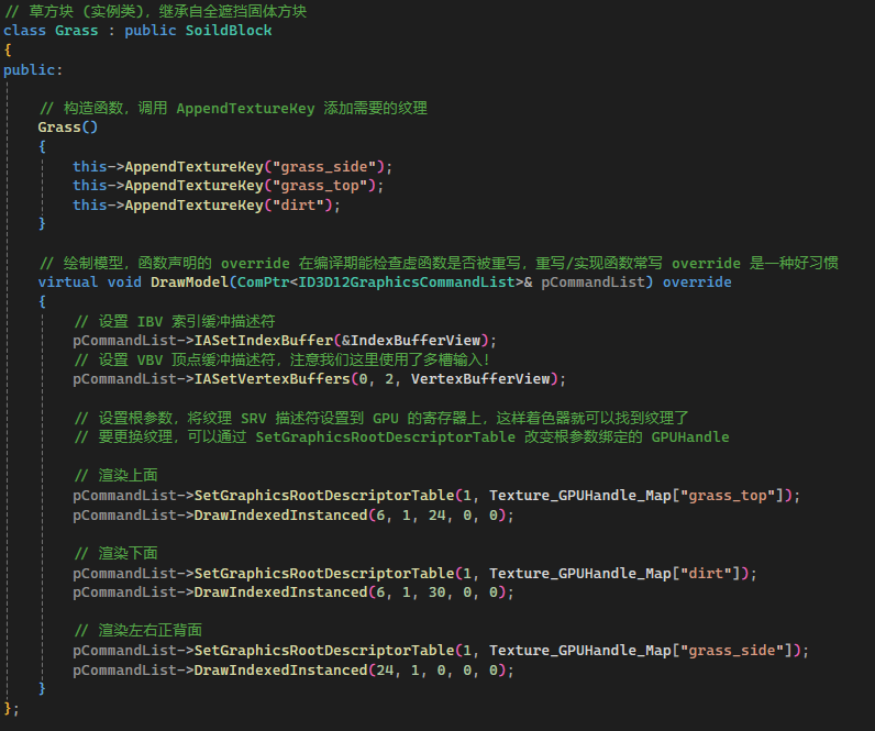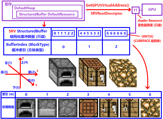 减少 DrawCall 的第一步,就是减少 SetGraphicsRootDescriptorTable 切换纹理到寄存器的次数!为什么呢?虽然这玩意的开销并不高,但是 DrawCall 期间寄存器是不能换绑纹理的!要么你就在下一次 DrawCall 之前调用 SetGraphicsRootDescriptorTable 切换纹理 (第 7-8 章我们所使用的方法,遇到工作台,熔炉这些三个面的方块,我们分三次渲染,每个方块三次 DrawCall):