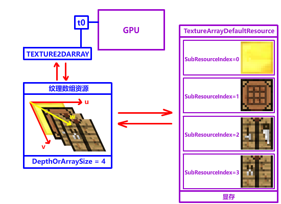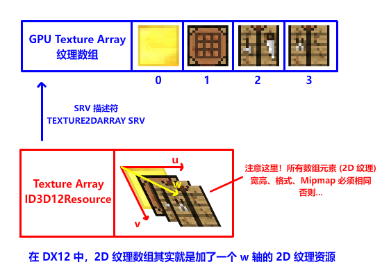 在此郑重介绍一位重量级解决方法:Texture Array 纹理数组,顾名思义,由多个纹理组成的数组。在 DX12 中,纹理数组其实是加了一个 w 深度轴的 2D 多层纹理,如果要在纹理数组中采样不同的纹理,只需要改变 w 坐标就行!