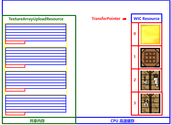 由于我们复制的是纹理数组,复制的时候还要多留个心眼,每复制完成一个子资源,要遵循 512 对齐要求偏移到正确的位置!否则会绘制不出纹理 (或者画错了)!这种渲染错误调试层可不会报错,一定要注意!
