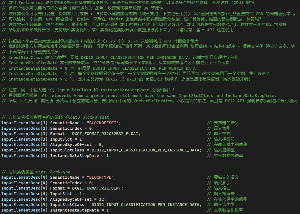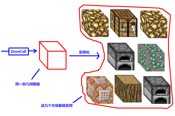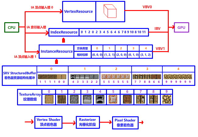 欢迎来到进阶篇第一章!在第 7-8 章,我们先后实现了画火柴盒与画玻璃,然而每画一个方块 (甚至画一个方块面) 就要切换一次 SRV 和 Draw Call。然而实际游戏的方块量比这多得多,用这种方法渲染的话会有很大的性能开销,造成游戏卡顿,最主要的原因就是频繁 Draw Call 产生高额的 CPU 固定开销和 GPU 流水线停顿。怎样才能尽可能的减少 DrawCall 呢?