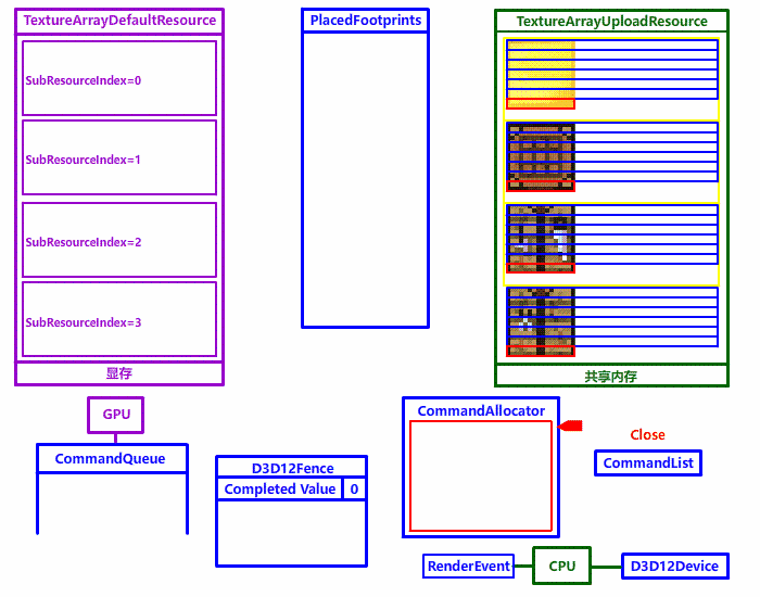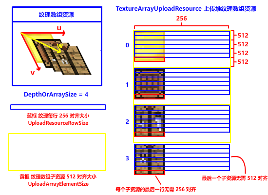 在纹理数组中,每个数组元素叫 SubResource 子资源,进行纹理数组复制的时候,硬件对齐有新的要求。对,你没听错,有新的要求。上传堆资源每个数组元素 (子资源) 之间还要进行 512 字节对齐 (D3D12_DEFAULT_RESOURCE_PLACEMENT_ALIGNMENT = 512),这样 DX12 API 才能正确复制并索引纹理: