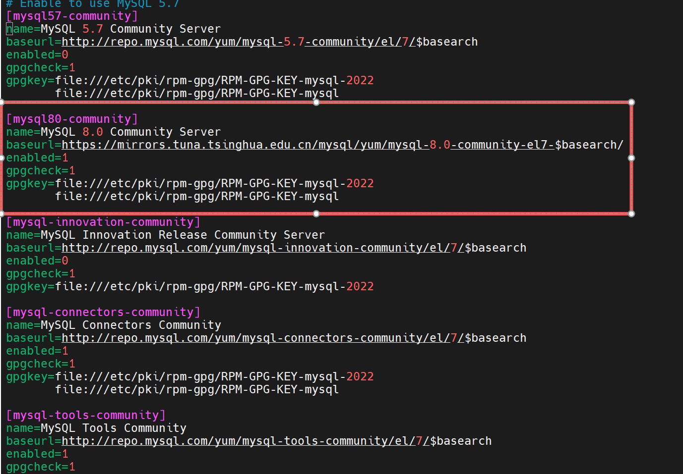 baseurl=https://mirrors.tuna.tsinghua.edu.cn/mysql/yum/mysql-8.0-community-el7-$basearch/