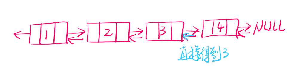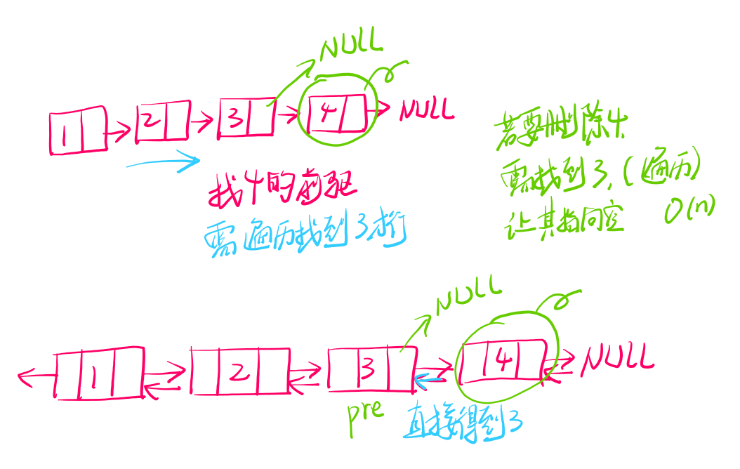 若是删除4号结点 ,双链表 可以直接找到前驱结点,让其指向空即可,时间复杂度为O(1)。