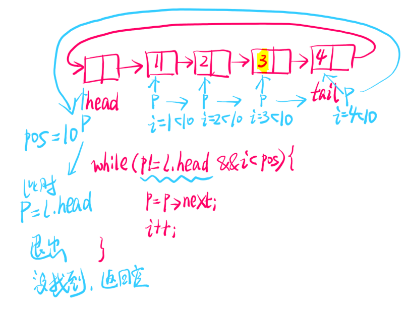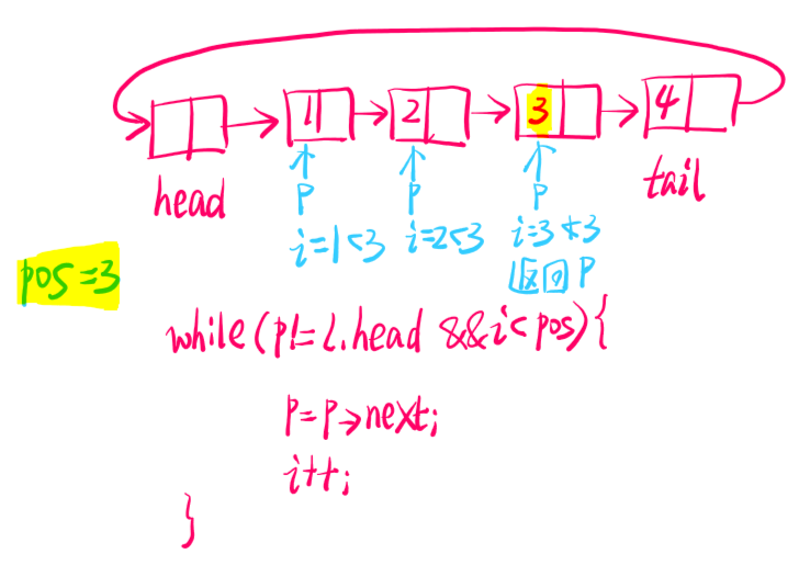 while (i < pos && p!=NULL) { //注意p不能为空,为空的时候就是表尾了