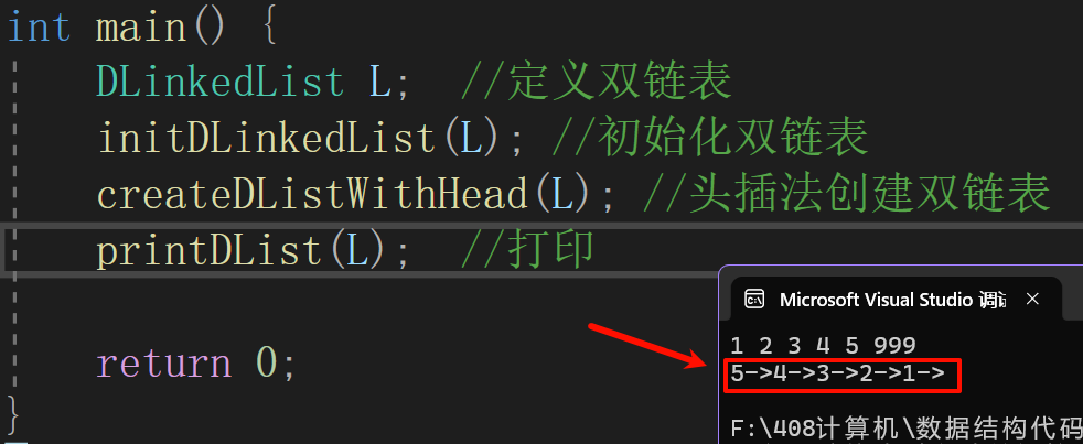 //createDListWithHead(L); //头插法创建双链表