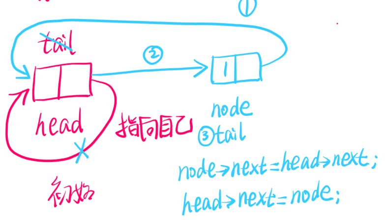 有一个表尾指针p,始终指向最后一个节点。注意每次先将node放好,然后再动p。