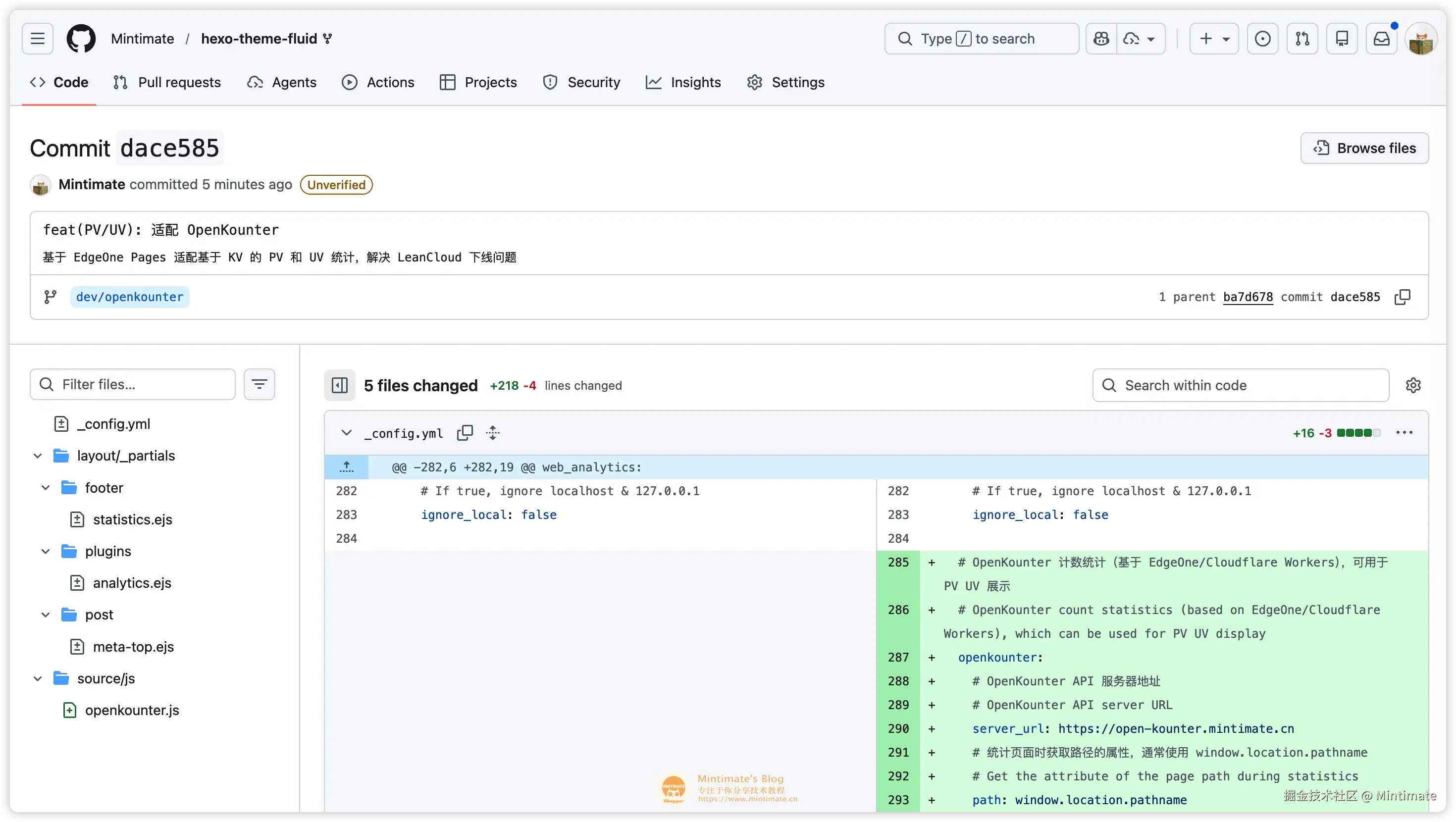 如果你是 Fluid 主题用户,可以查看我的这个 Fork 的这次 Commit: Mintimate/hexo-theme-fluid/commit/dace585020440402641db7e87a189245aa83a0a3,它展示了如何修改主题来兼容 OpenKounter。