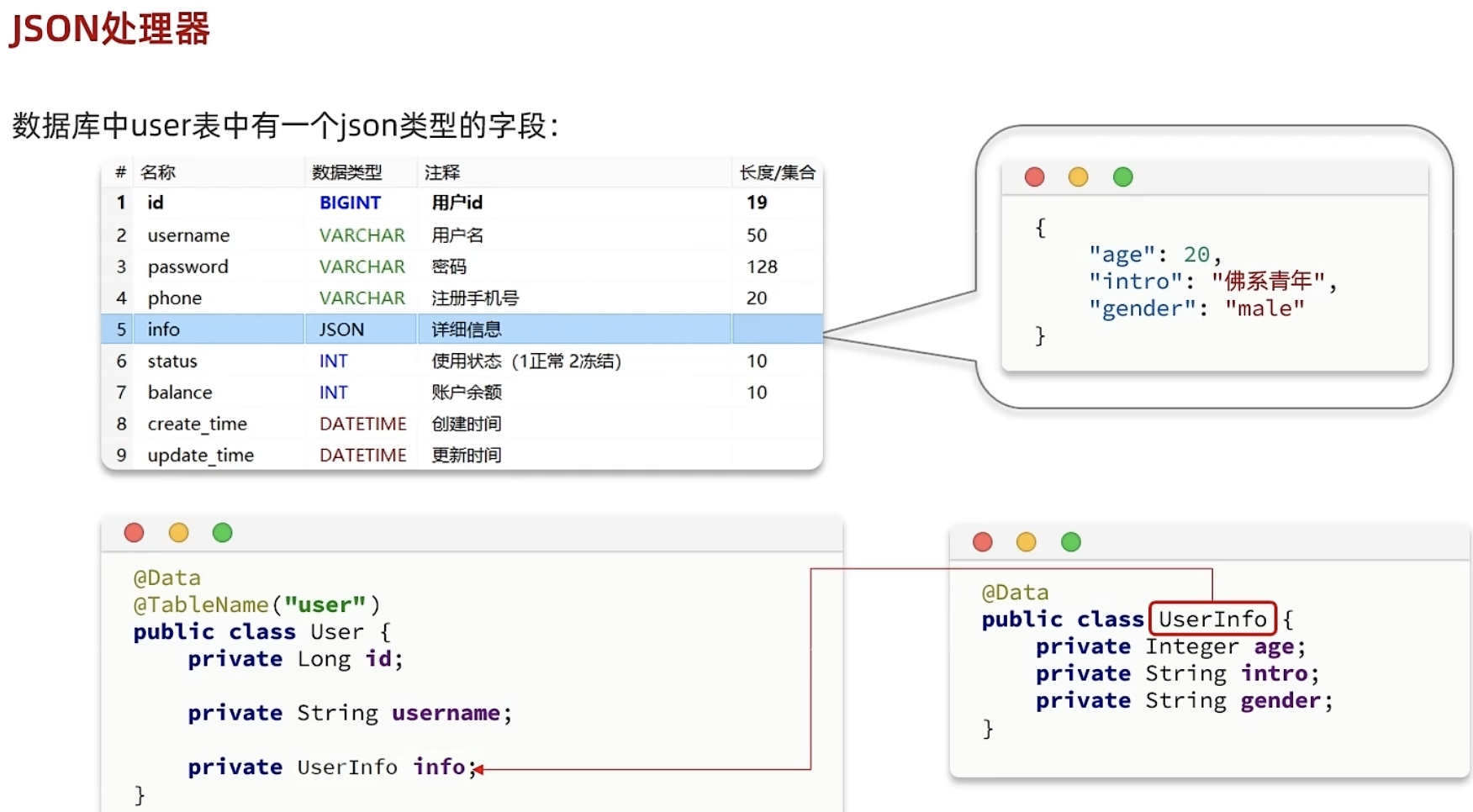 当数据库字段是 JSON 类型 ,实体类属性是 Java 对象/集合 时: