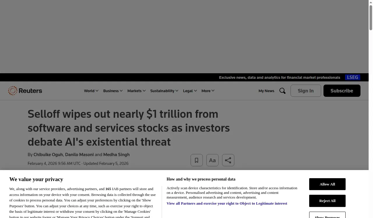 ▲ 路透社报道:AI引发存亡焦虑,软件和服务类股票近1万亿美元被抛售(2026.02.04)