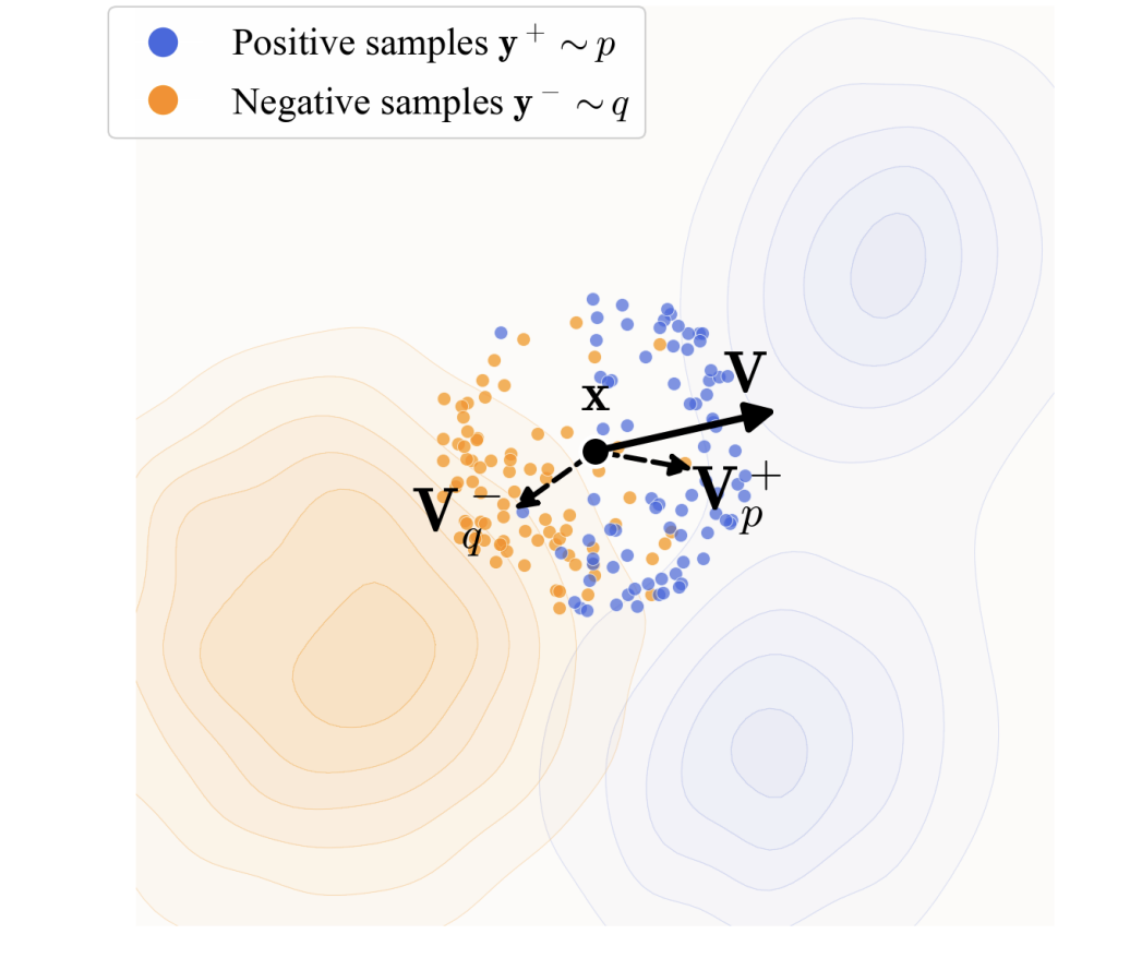Vp+(x)=1Ey+∼p[k(x,y+)]Ey+∼p[k(x,y+)(y+−x)]\mathbf{V}^+p(\mathbf{x}) = \frac{1}{\mathbb{E}{\mathbf{y}^+ \sim p} [k(\mathbf{x}, \mathbf{y}^+)]} \mathbb{E}{\mathbf{y}^+ \sim p} [k(\mathbf{x}, \mathbf{y}^+)(\mathbf{y}^+ - \mathbf{x})]Vp+(x)=Ey+∼p[k(x,y+)]1Ey+∼p[k(x,y+)(y+−x)]